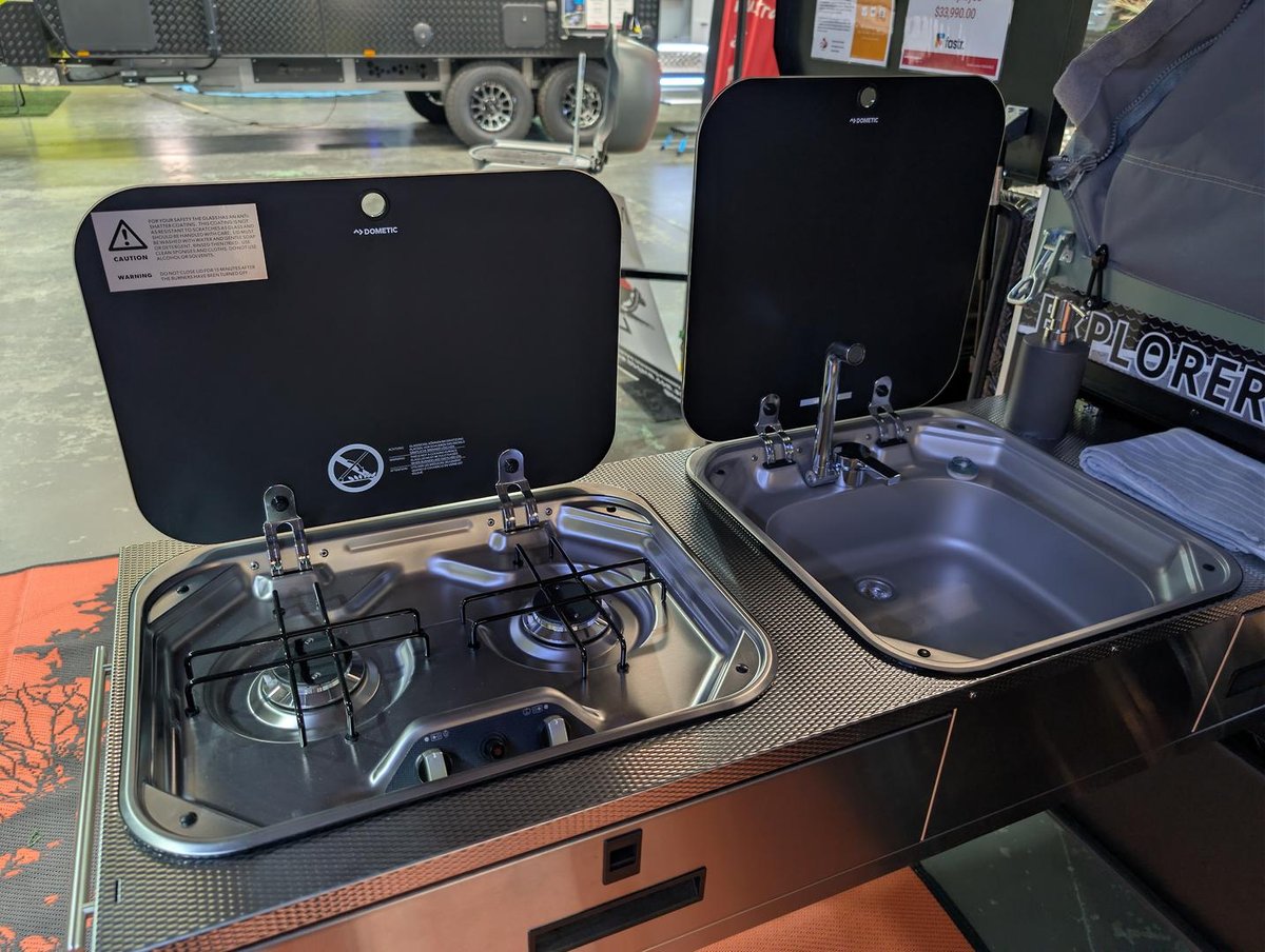 Cub Explorer kitchen with 2-burner stove, wind shield & sink
