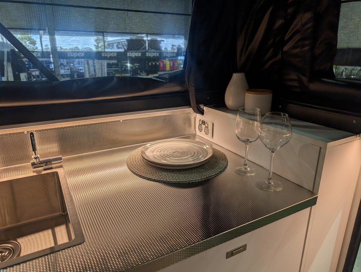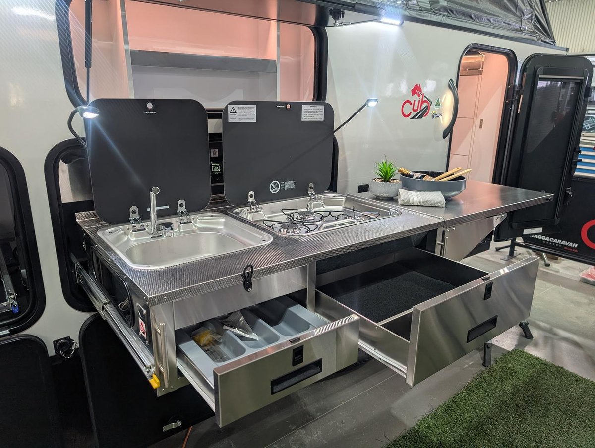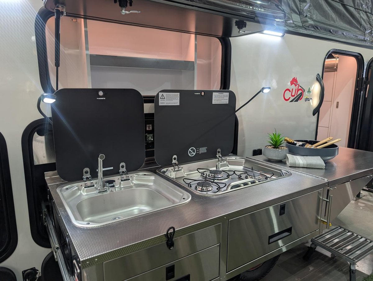 Inside, you’ll find a cleverly designed layout ideal for relaxing after a day of adventure. The internal kitchenette now features 50% more bench space and storage compared to other Cub hybrids—plenty of room for cooking and prepping. The internal ensuite includes a full shower and Thetford cassette toilet, making off-grid travel more comfortable than ever.