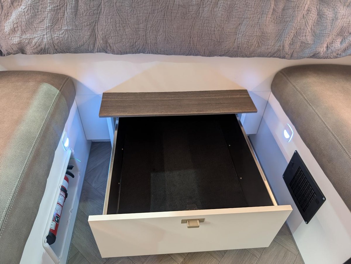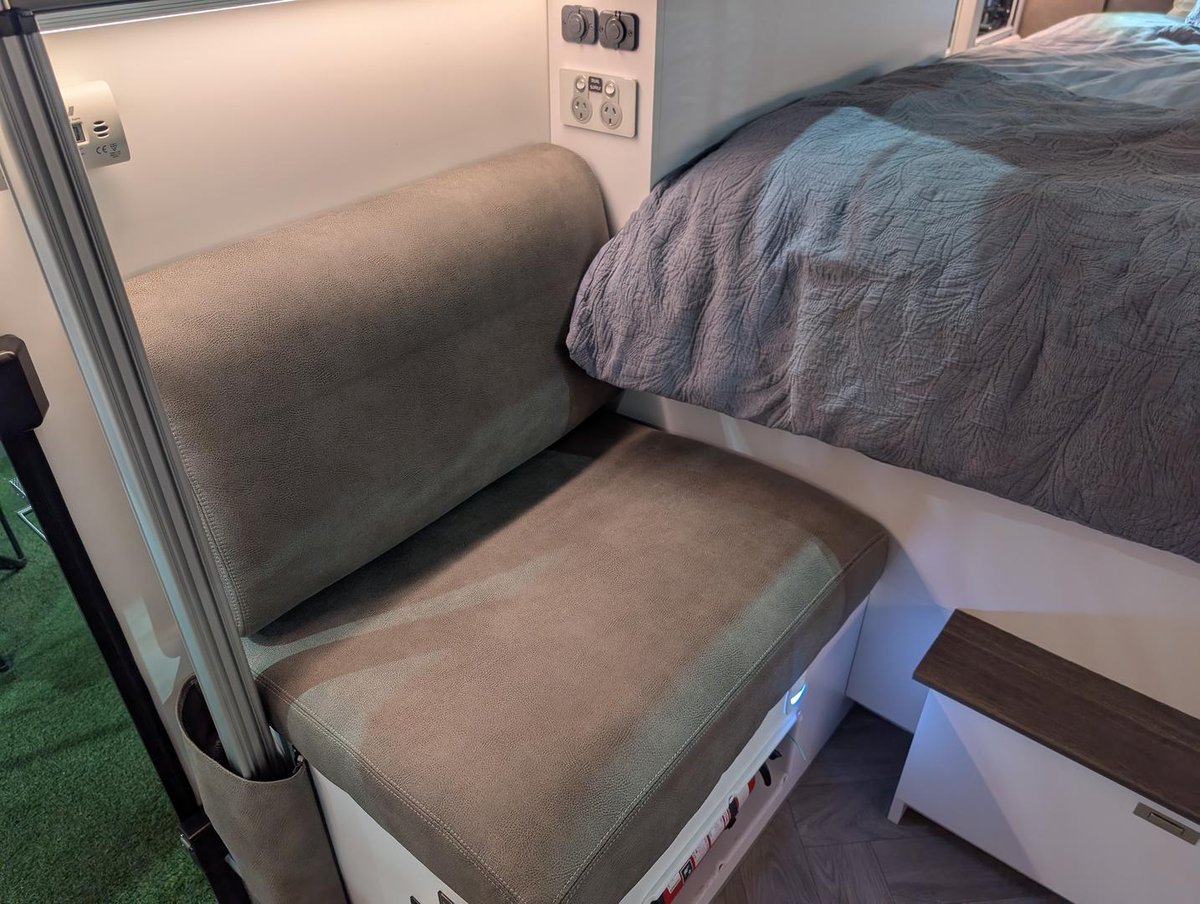 Standing out from the crowd with its bold, darker colour scheme, the F14 breaks the mould of the typical Cub hybrid. At just 2.06m high when travelling, it’s the lowest-profile Cub hybrid to date—perfect for streamlined towing and easy storage. Once parked, the electric pop-top roof extends the internal height to a roomy 2.035m, offering generous headroom and a surprisingly spacious interior.