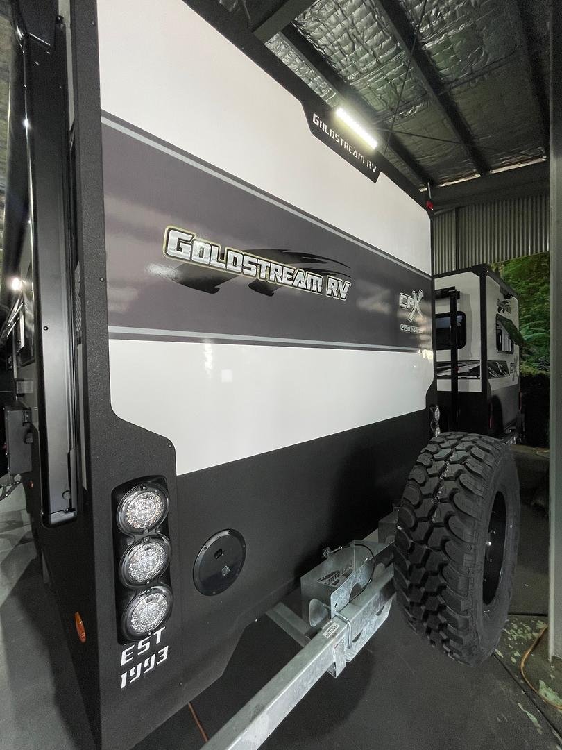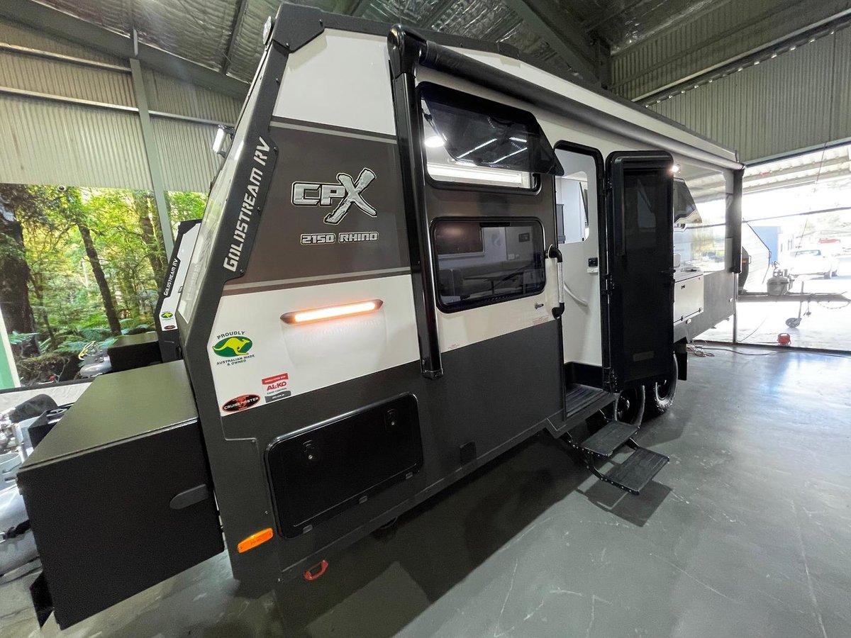 The external features in our Rhino CPX package are the white composite walls with one piece composite honeycomb flooring and Tufflon protective coating front, sides and rear. Hot dipped galvanized 6" chassis and 6" A-frame, Cruisemaster independent suspension, roll out awning, 2 x 95lt water tanks, 2 x 9kg gas bottles, picnic table, reverse camera, 2 X 220 watt solar panels, 1 X 200 amp lithium battery, grey water tank, gas bayonet, stone guard with mud flaps, D0-35 hitch, 2 14" LED spotlights, 3 x 95lt water tanks, deluxe upholstery, telescopic table, external Fusion speaker panel. x Jerry can holders, 16" wheels to all models, 3 in 1 USB/TV/12V point plus much more.