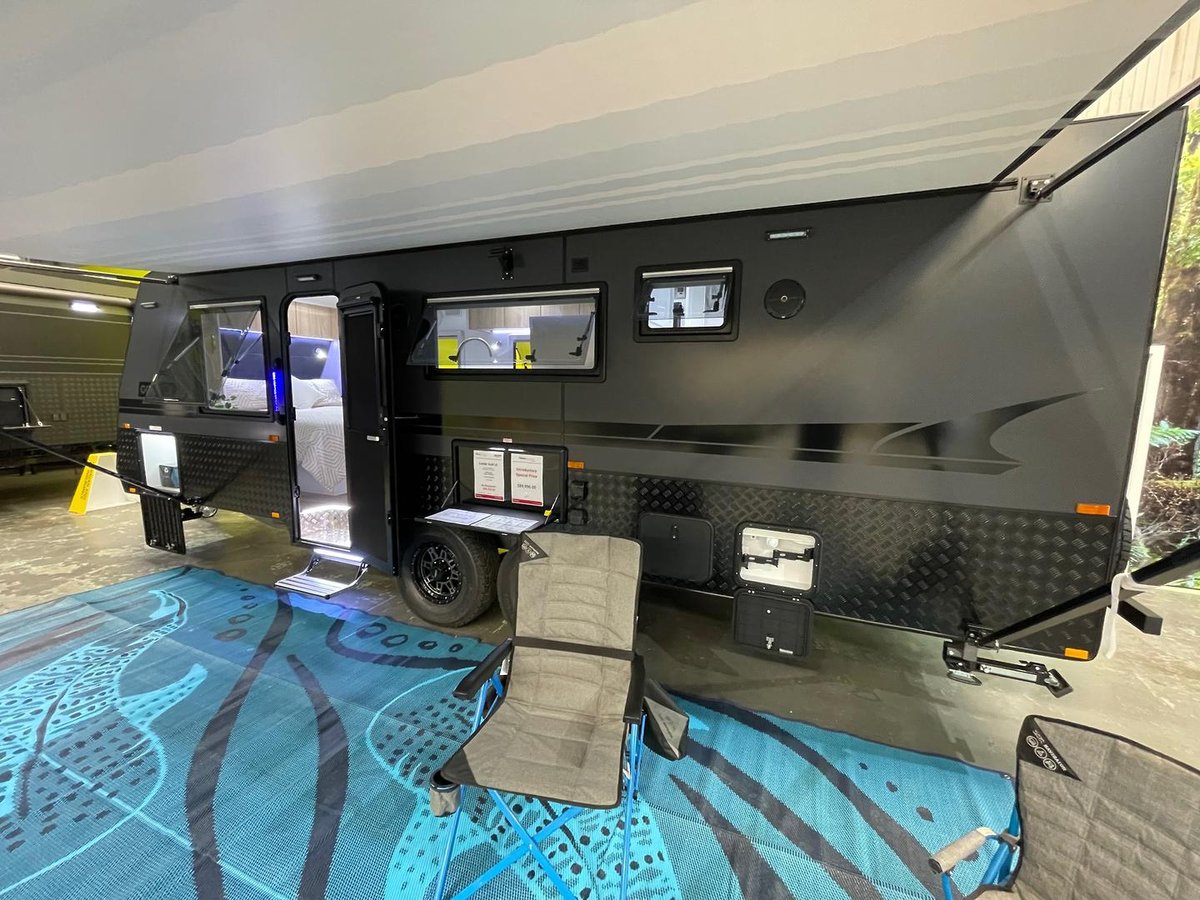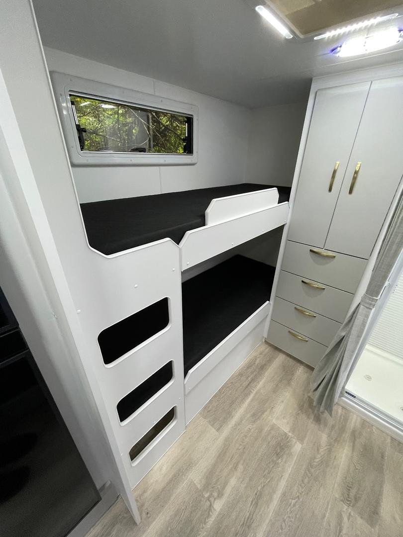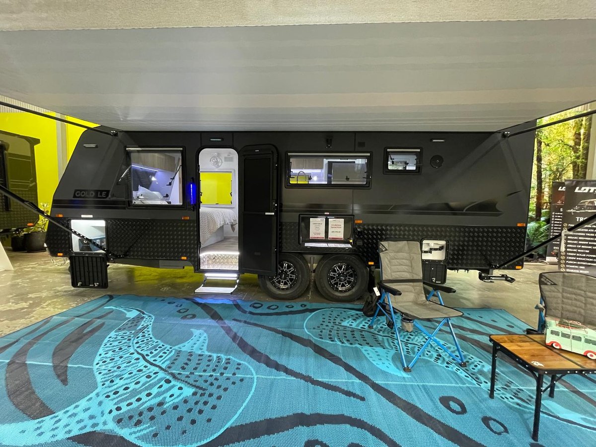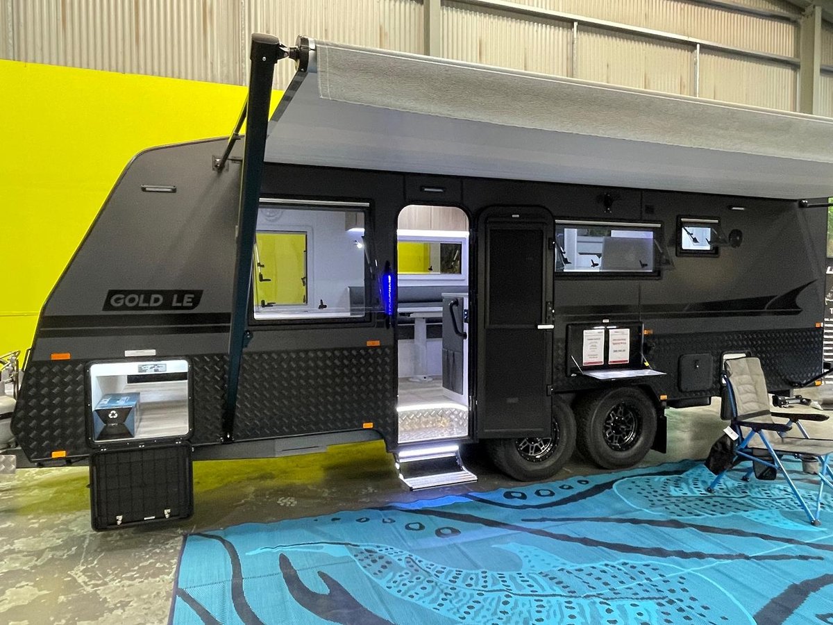 Presenting this beautifully appointed Leader Gold LE Double Bunk Caravan, built to a high specification and finished in the sought-after all-black external theme. Designed for comfortable touring with the whole family, this van combines robust construction, modern luxury, and excellent off-grid capability.