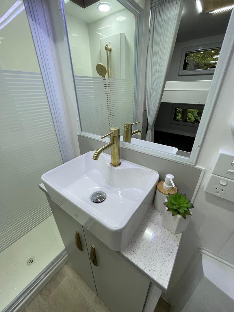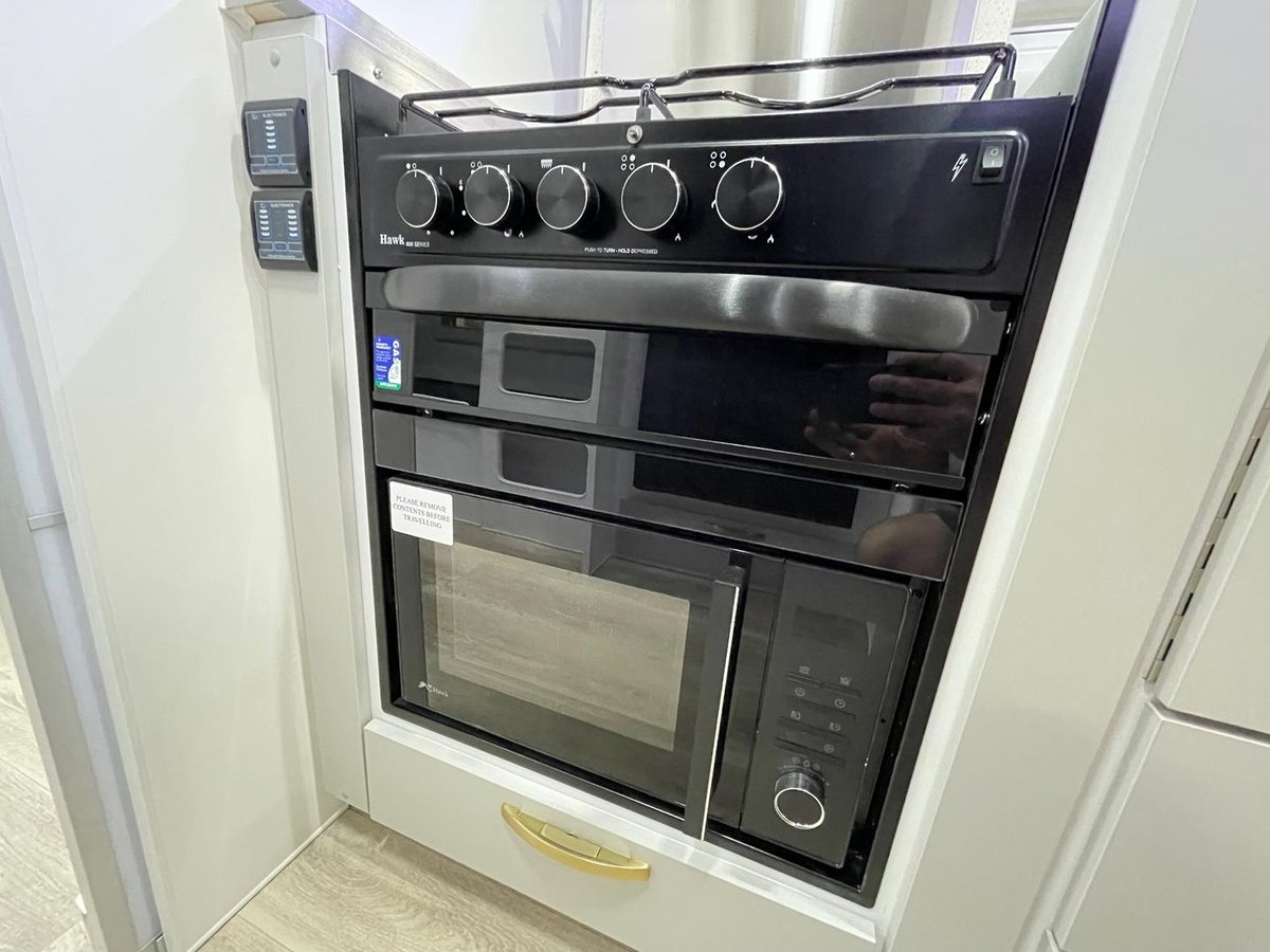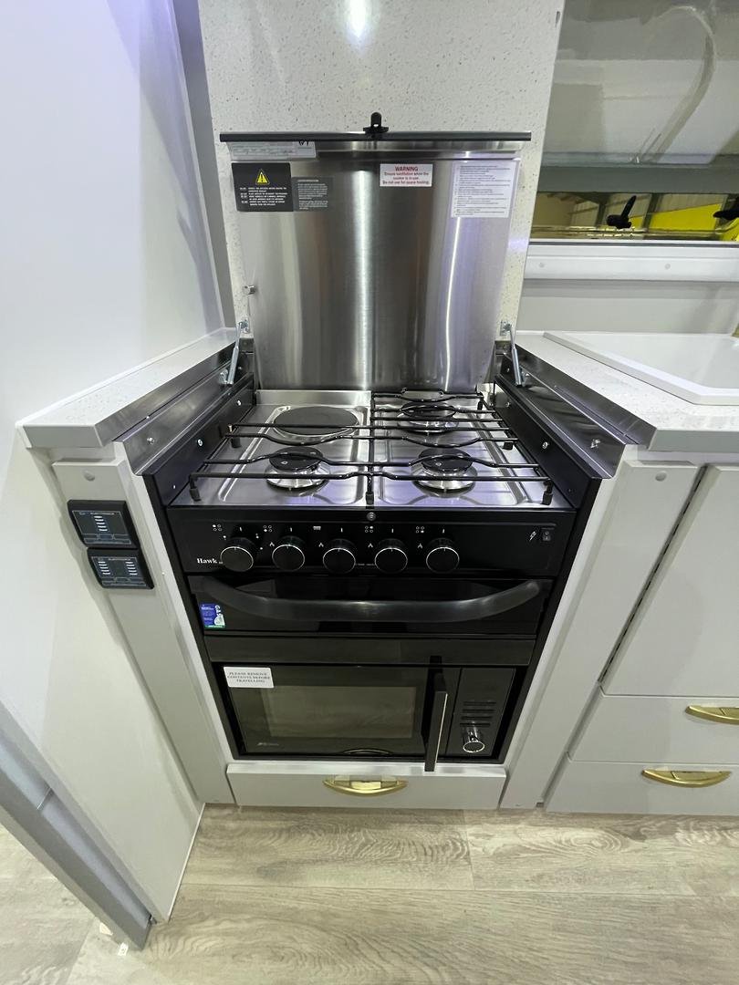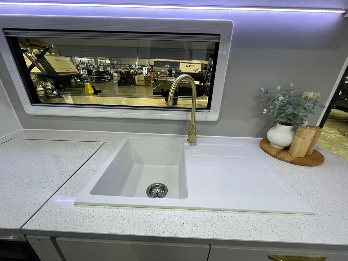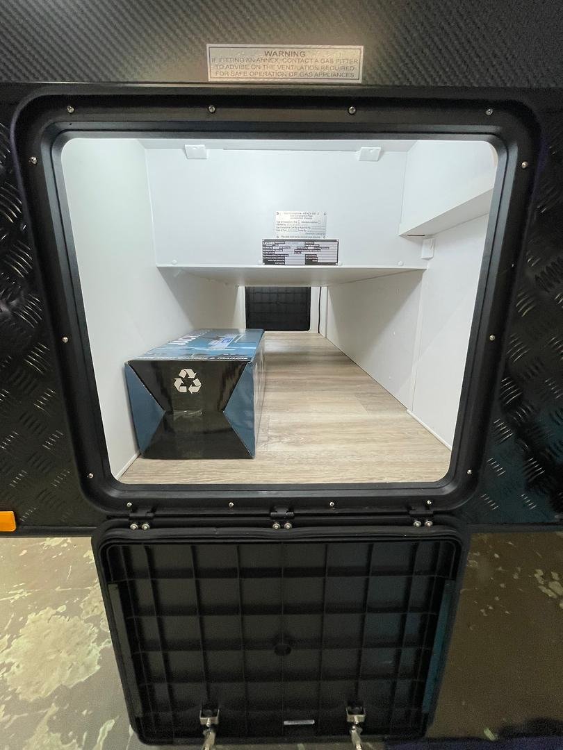 Presenting this beautifully appointed Leader Gold LE Double Bunk Caravan, built to a high specification and finished in the sought-after all-black external theme. Designed for comfortable touring with the whole family, this van combines robust construction, modern luxury, and excellent off-grid capability.