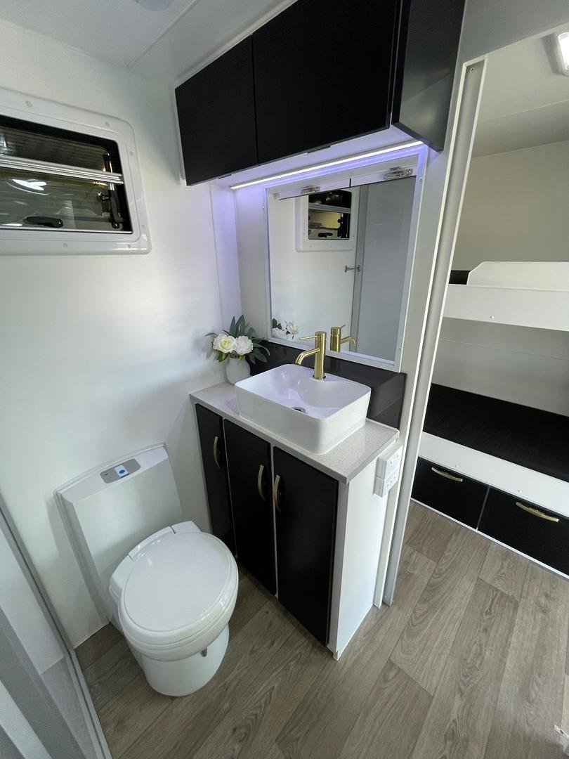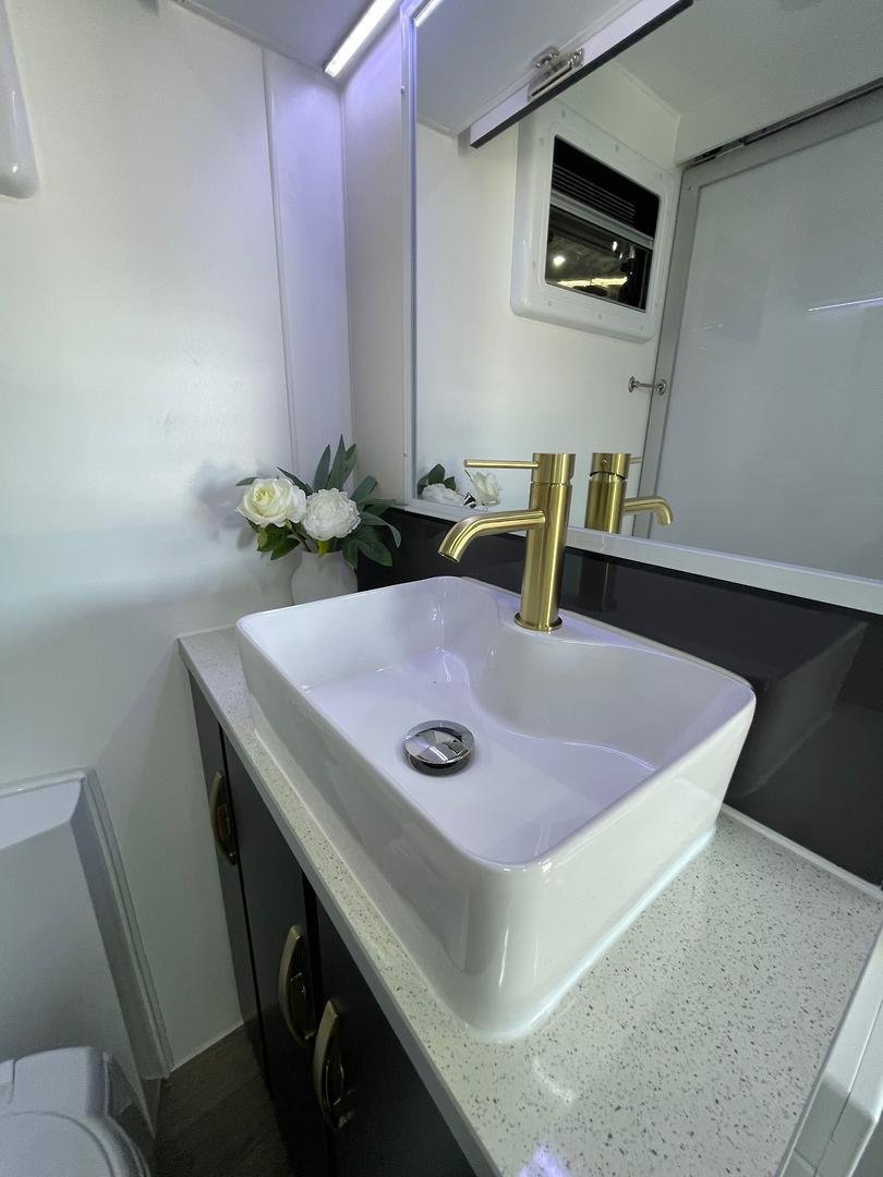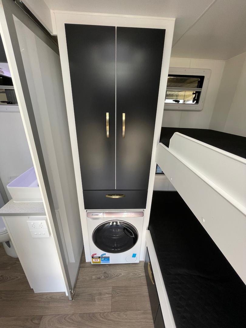 The full ensuite offers hotel-style comfort with a separate shower featuring gold hardware, a Thetford swivel toilet with china bowl, and a contemporary vanity. For added convenience, this caravan also includes a Camec Compact RV 4kg front-load washing machine, making it ideal for extended touring.