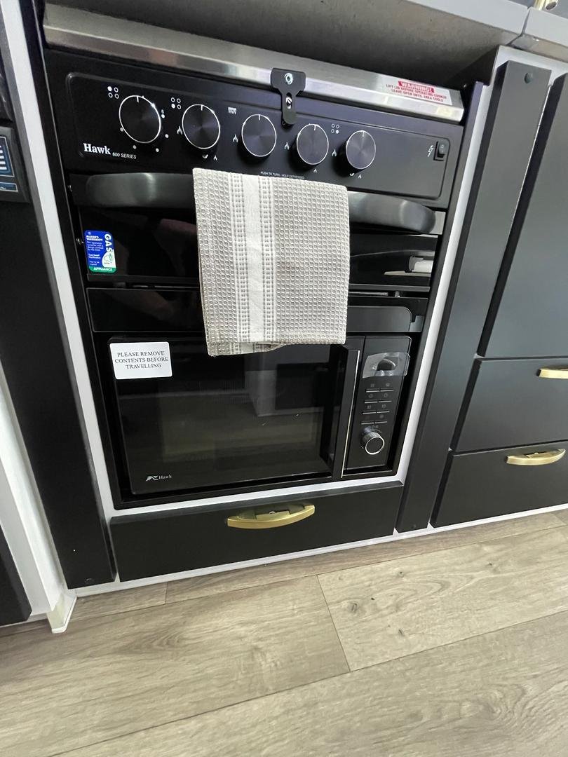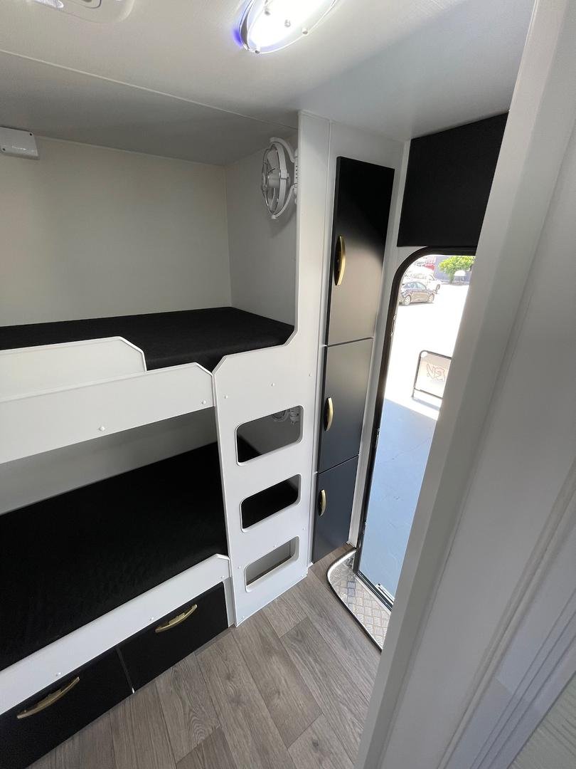 The family-friendly layout includes double bunk beds, each with dedicated storage, plus a comfortable main bed with overhead cupboards. Upholstered in Viva Obsidian, the seating and sleeping areas provide a luxurious yet practical finish ideal for long trips.